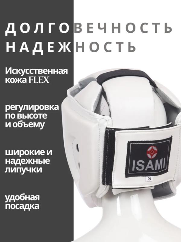 Открытый шлем с защитой подбородка для карате кекусинкай Isami. Шлем Isami — надёжная защита для спортсменов, практикующих карате Кёкусинкай, кудо, тхэквондо, ММА и другие единоборства. Модель сочетает безопасность, комфорт и эргономику, подходит для регулярных тренировок, спаррингов и аттестаций.